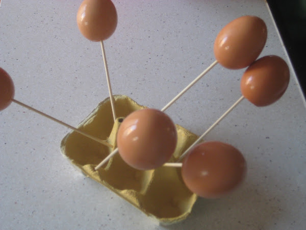 Los ponemos en la huevera que preparamos metiendo el palito por el agujero y así se podrán secar.
