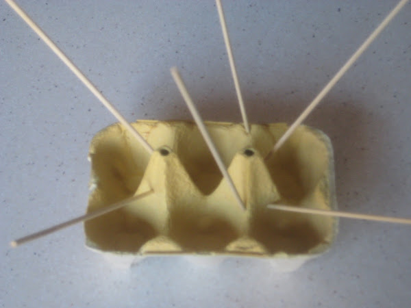 En una huevera pinchamos las brochetas de madera que lo utilizaremos para poner los huevos a secar.
