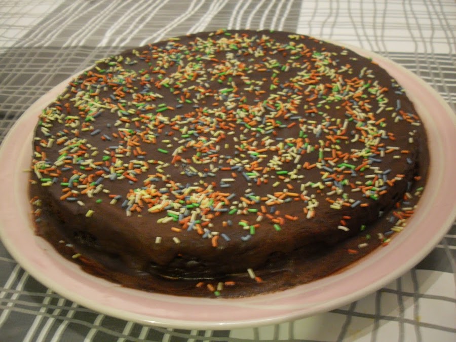 Cubrir el bizcocho con la cobertura de chocolate y adornar al gusto, en esta ocasión se puso granitos de colores.