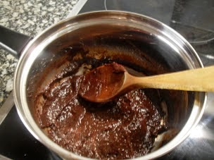 En un cazo se derrite la mantequilla pomada ( temperatura ambiente) con el chocolate poco a poco y se le añade una copa de coñac hasta tener una crema algo espesa.