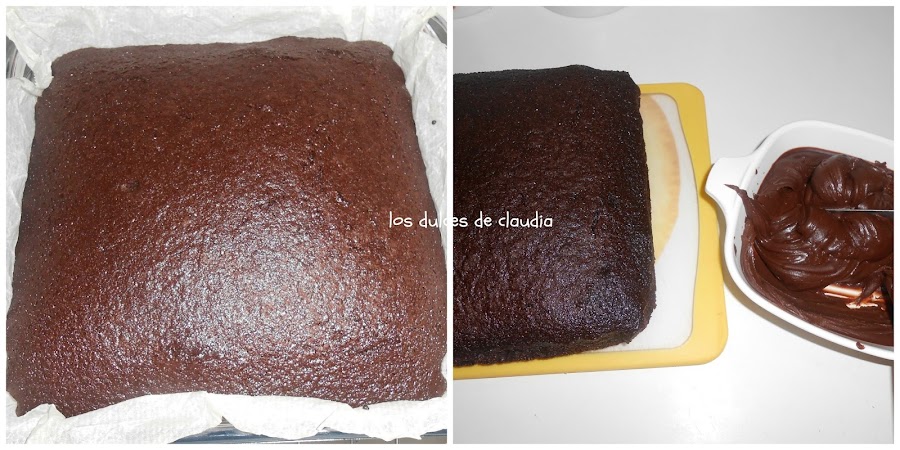 Yo le puse papel vegetal . Hacer la cobertura mezclando 100 gramos de nata (crema de leche) con 100 gramos de chocolate en una olla a fuego lento. Integrar. Enfriar y cubrir el bizcocho.