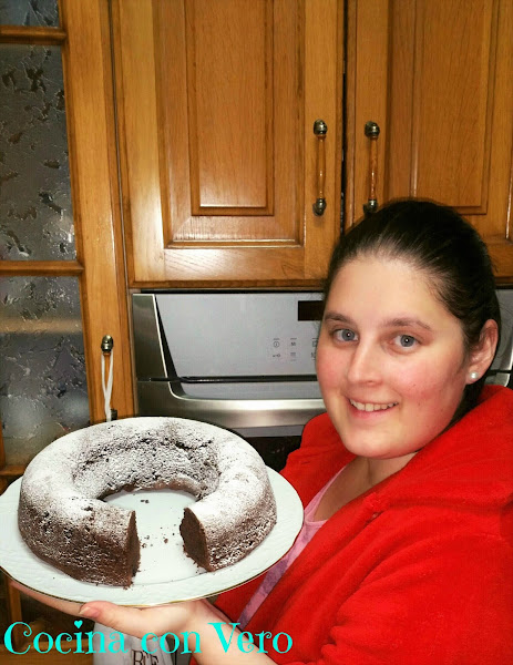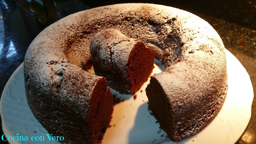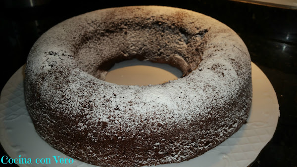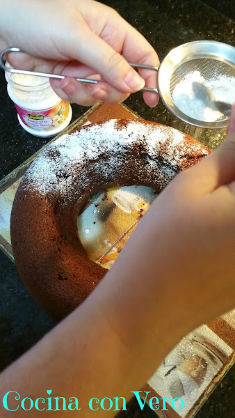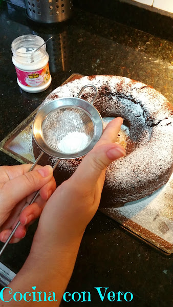5/ Esperamos a que esté frío para proceder a hacer la presentación espolvoreando por encima de él azúcar glas ayudándonos de un colador y con la mano dándole toquecitos para repartirlo por todo el bizcocho.