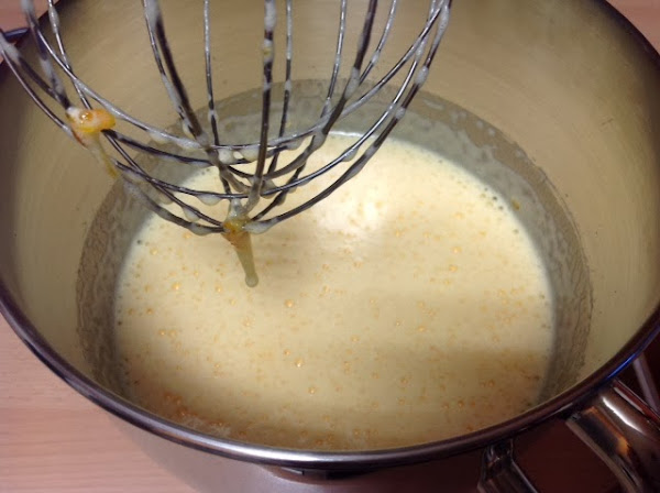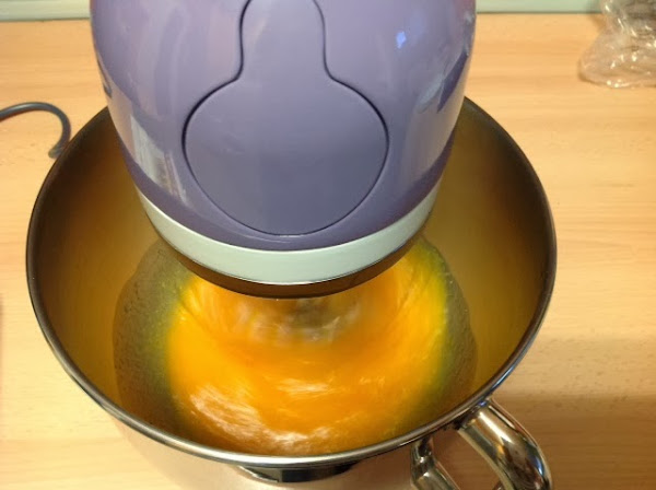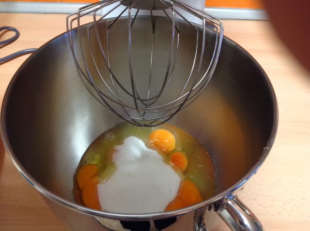 En un bol grande, ponéis los huevos y el azúcar y batís hasta que veáis que la mezcla empieza a blanquear y queda esponjosa.