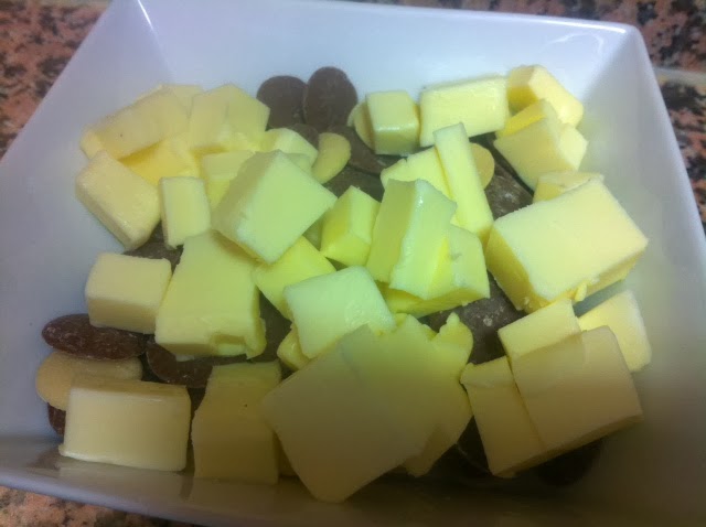 Derretimos el chocolate. Para ello, ponemos en un cuenco el chocolate en pastillas (también sirve el de cobertura) y la mantequilla cortada en tacos un par de minutos en el microondas para que se disuelva todo.