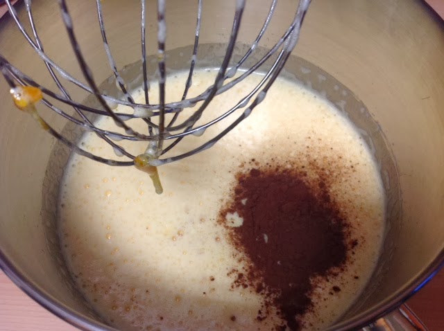Una vez integrado, incorporar poco a poco la harina (preferiblemente tamizada), la levadura y el cacao puro en polvo.