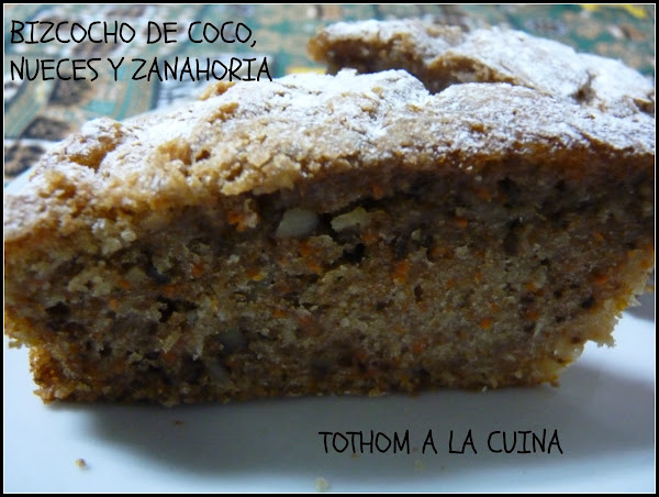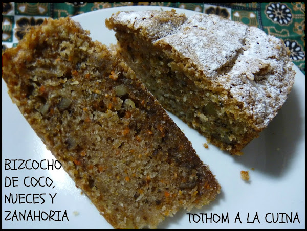 Hoy os traigo el cuerpo del delito, jijiii, un bizcocho de coco, nueces y zanahoria, ale, dando finiquito a los restos que todavía me quedaban de los productos que tengo rodando por la despensa y llamo "por si..."