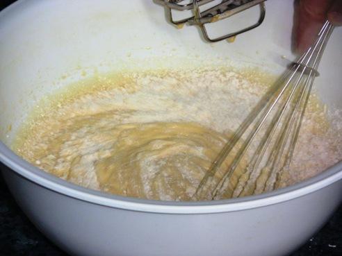 Lo siguiente ya es ponerle la harina a la que habremos añadido la levadura en polvo y el coco rayado, con el batidor de mano lo mezclamos todo bien y cuando no se vea harina terminamos con el batidor mecánico.