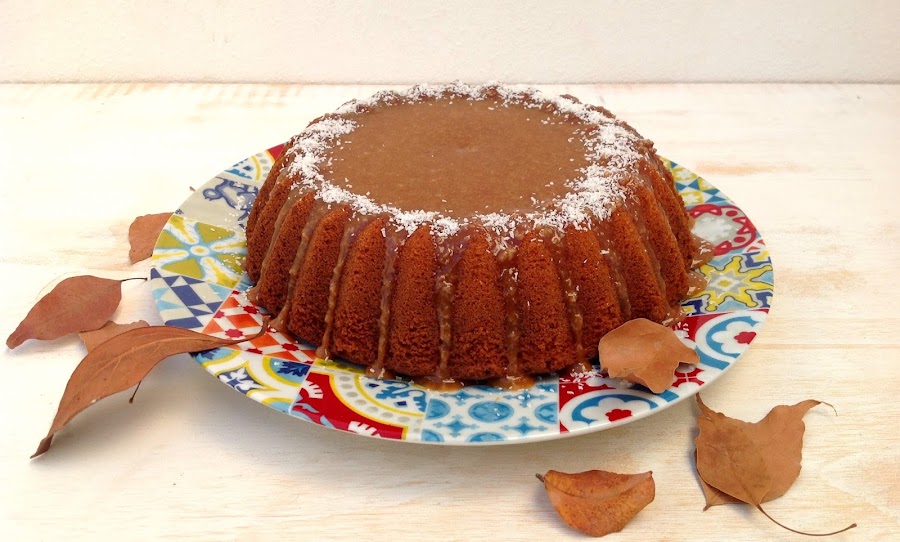 Cubrimos con la salsa de toffee el bizcocho y decoramos con un poco de coco rallado.
