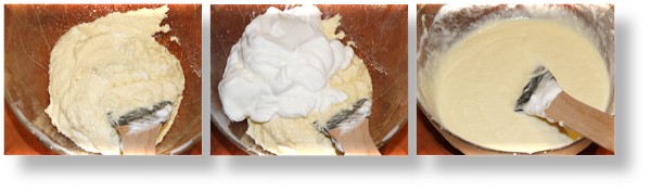 Obtendrás una masa muy espesa, retira a un bol. Incorpora las claras montadas y mezcla con ayuda de una espátula cuidadosamente.