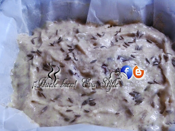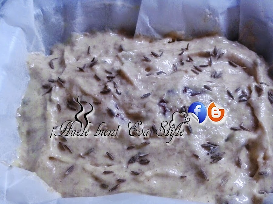 4.- Vertemos la mezcla de los huevos sobre la harina, ayudandonos con una espátula plana y utilizando movimientos envolventes; añadimos los tomates picados y una pizca de comino. Echamos la masa en un molde plum cake engrasado y forrado con papel de horno. Esparcimos sobre la masa un poco de comino.