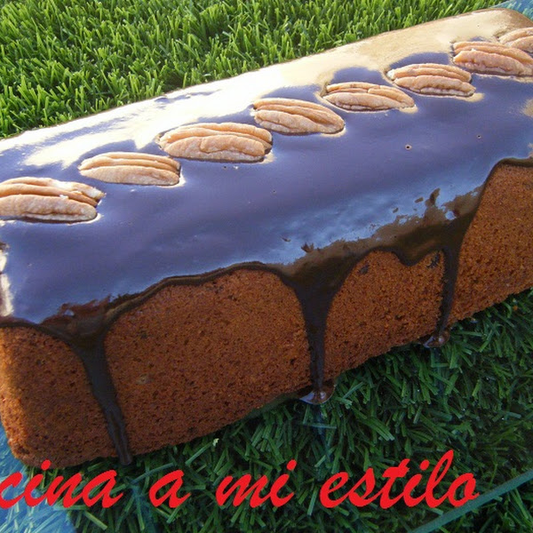 Bizcocho de dátiles y nueces aromatizado con canela y jengibre y con cobertura de chocolate