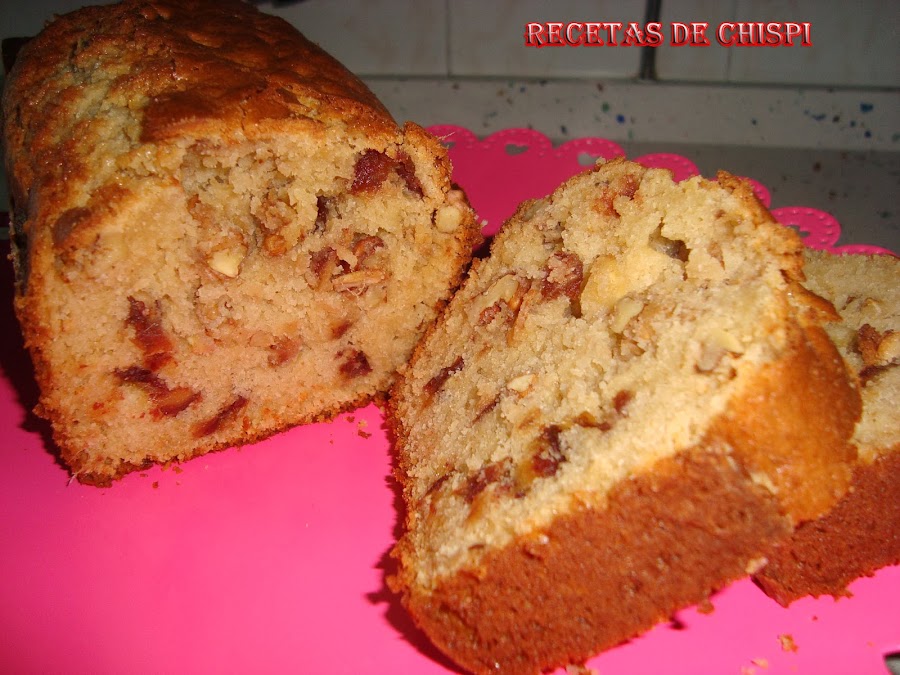 Picamos los dátiles y nueces y lo añadimos al molde con la mezcla, con una espátula vamos mezclando bien para que esté bien repartido, meter en el horno que bajaremos a 170º y hornear durante 35 minutos, para comprobar que esta hecho pinchamos el bizcocho con un palillo de brocheta, si sale húmedo lo dejamos 5 minutos más