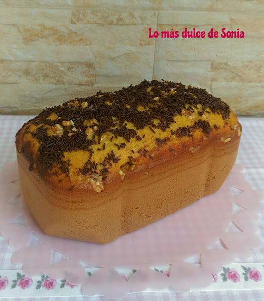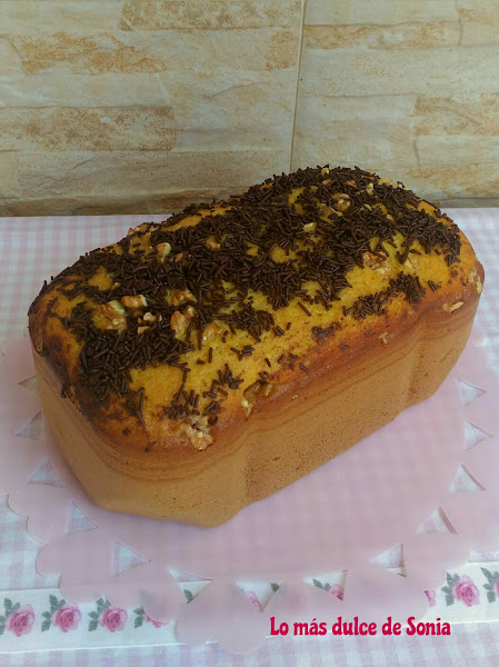 Una vez comprobado que el bizcocho está hecho, dejamos unos minutos y desmoldamos. Yo lo hago con el bizcocho caliente. Espolvoreamos con virutas de chocolate.