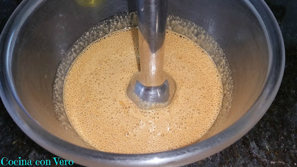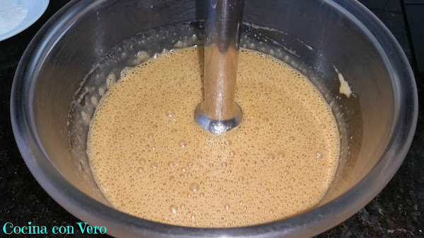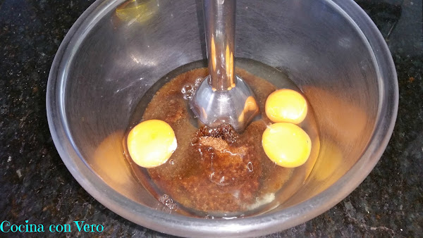 1/ En un bol batimos con la batidora los huevos con el azúcar hasta obtener una masa homogénea.