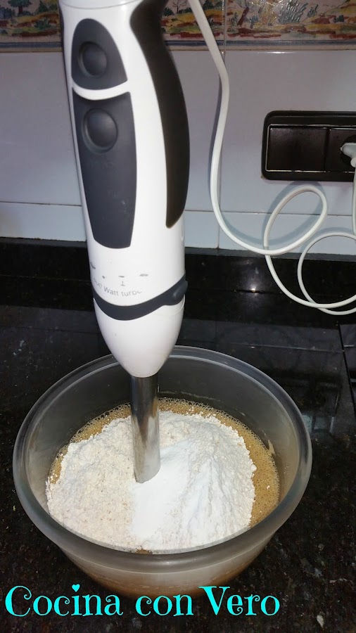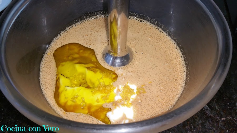 2/ Añadimos el aceite, el yogur y la ralladura de limón, batimos de nuevo y vamos añadiendo la harina de espelta y la levadura en polvo hasta que quede todo líquido.