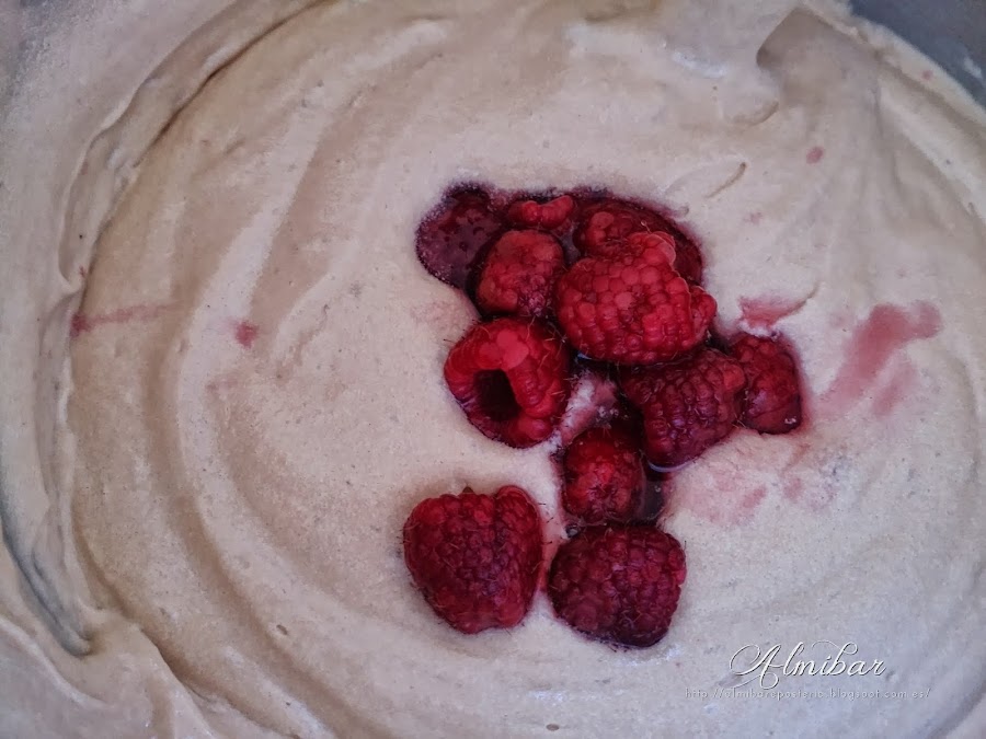 ...con mucho mimo mezclas las frambuesas en la masa para que mantengan la forma y no rompan...
