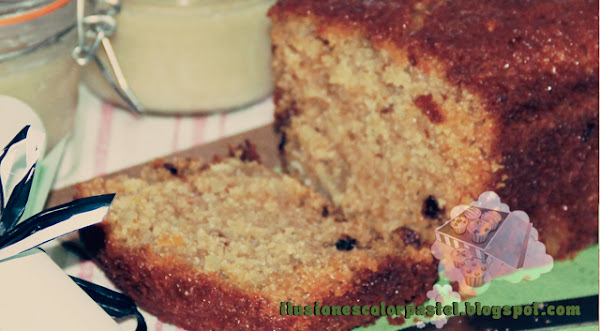 Al resto de masa que nos quede en el bol, se le añaden: dos vasos de harina + uno de aceite de girasol + uno de nueces + uno de azucar + uno de leche + un sobre de levadura + 2 huevos + una manzana troceada + 180 gr. de pasas + una pizca de sal, canela o vainilla.