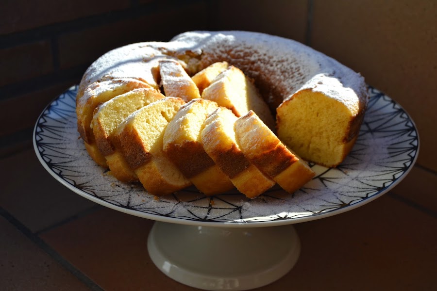 Metemos en el horno precalentado a 170 grados con calor arriba y abajo durante unos 30 minutos, pinchamos con una aguja y si sale limpia sacamos el bizcocho, dejamos templar y volcamos en unafuente. Espolvoreamos de azúcar molida.