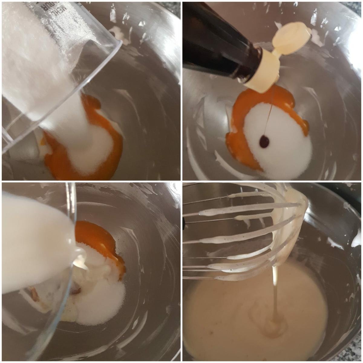 Batir las yemas Ahora batimos las yemas, con el resto del azúcar, la esencia de vainilla y la leche, hasta que dupliquen su volumen y blanqueen.