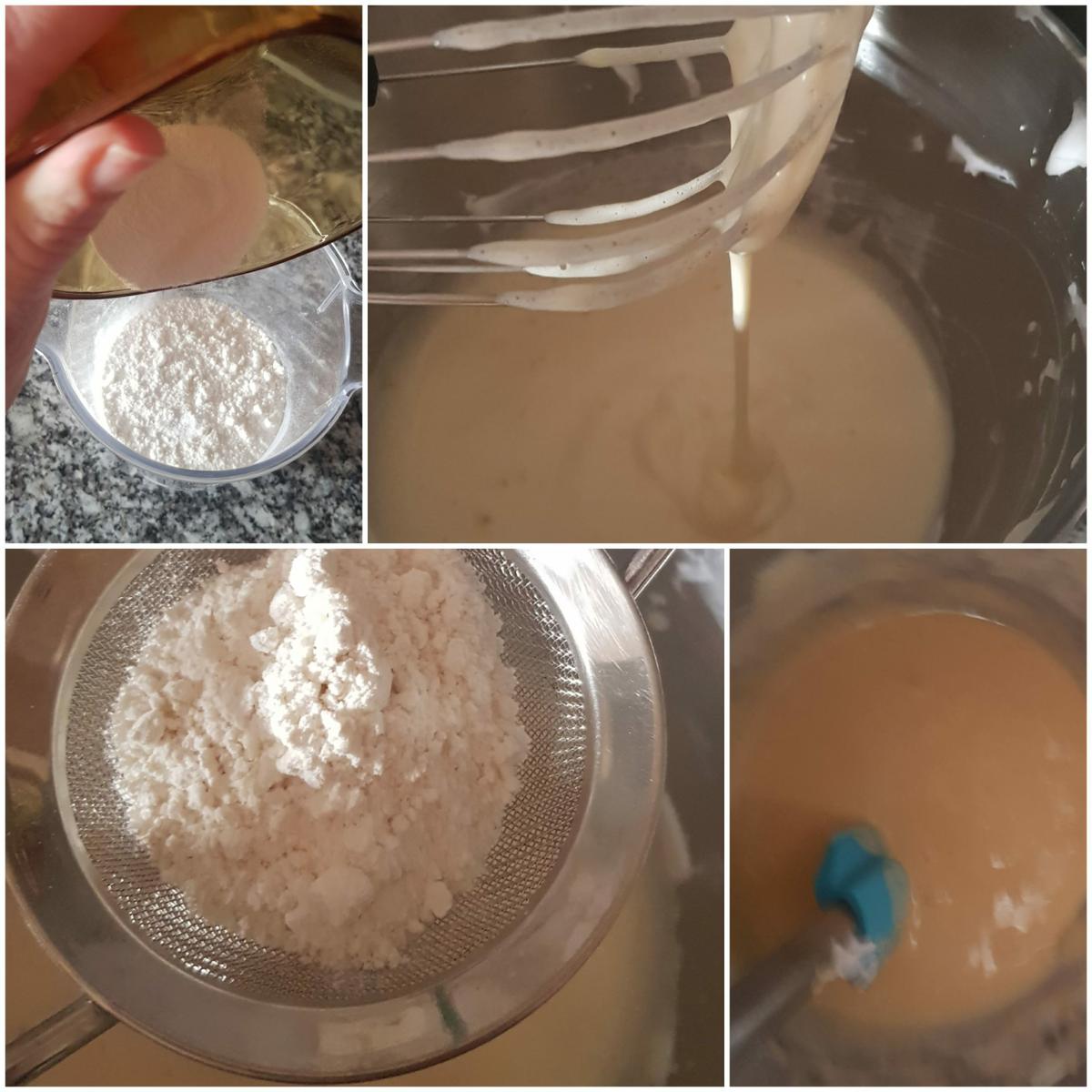 Tamizar la harina Mientras se baten las yemas, mezclamos la harina con la levadura, y cuando estén las yemas bien batidas, tamizamos la harina y removemos bien, o a mano o también con las varillas eléctricas.