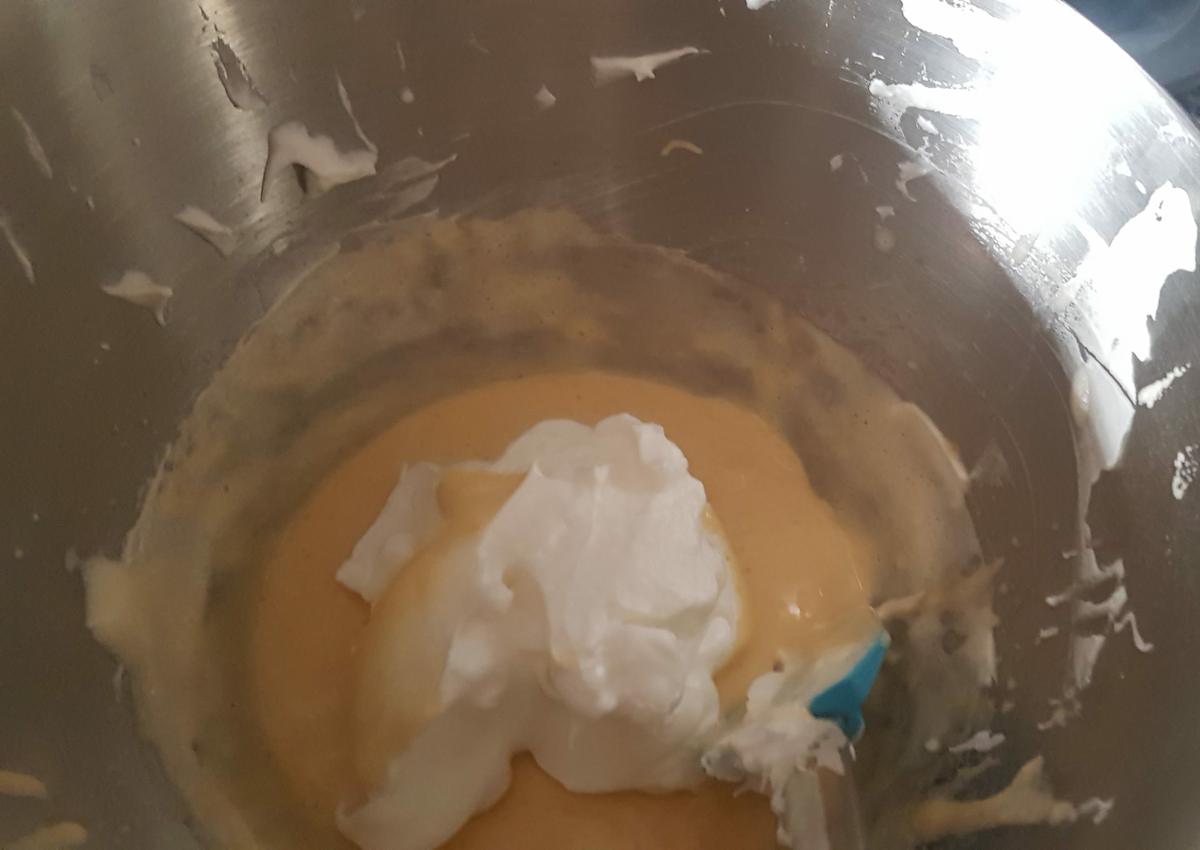 Incorporar las claras Cuando terminemos de mezclar las yemas con la harina, incorporamos de poco a poco las claras montadas que habíamos reservado, con movimientos envolventes para que no se nos baje la mezcla.