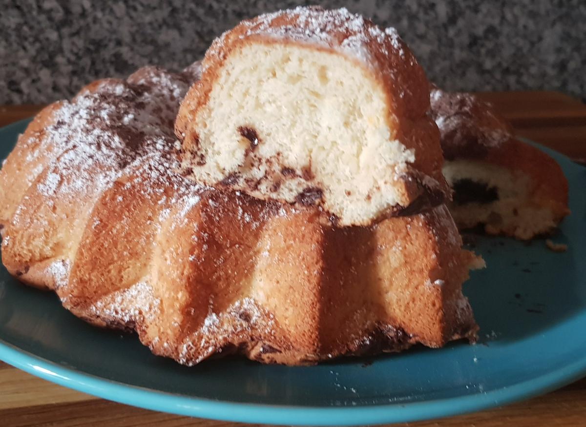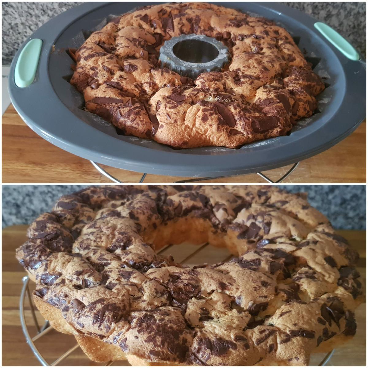 Al horno! Una vez tengamos la mezcla homogénea, lo vertemos en el molde que estará previamente engrasado, y le añadimos las chispas de chocolate, y con la ayuda de un cuchillo removemos bien para que queden bien repartidas, y lo metemos en el horno que estará a 190ºC, cuando introduzcamos nuestro biscocho bajaremos la temperatura a 180ºC, y hornearemos durante unos 20 minutos.