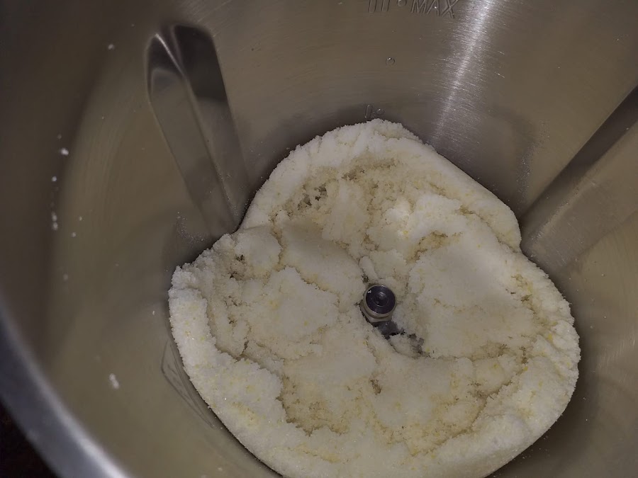 Empezamos agregando a la jarra el azúcar y la cáscara de limón. Programamos velocidad 9 durante 30 segundos.