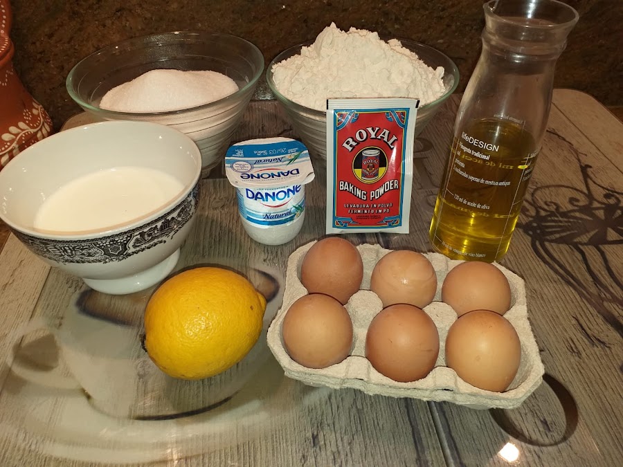 500 gr de azúcar, 500 gr de harina, 250 ml de leche, 250 ml de aceite, 6 huevos, 1 sobre de levadura royal, 1 limón, 1 yogurt natural y 1 pellico de sal.