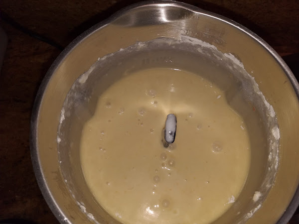 Si una parte de la mezcla se queda por las paredes de la jarra la bajaremos con la espátula y volveremos a mezclar unos segundos más.