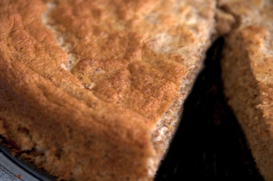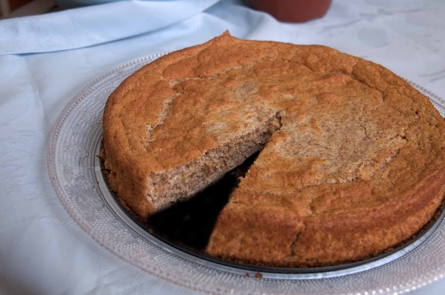 Batimos las claras a punto de nieve, reservamos. Mezclamos el resto de ingredientes y cuando esté bien homogéneo añadimos con cuidado las claras a punto de nieve. Forramos un molde de 24 cm con papel de horno y le ponemos la mezcla. Metemos al horno, que ya tenemos calentado a 180º durante 30 minutos, aproximadamente.
