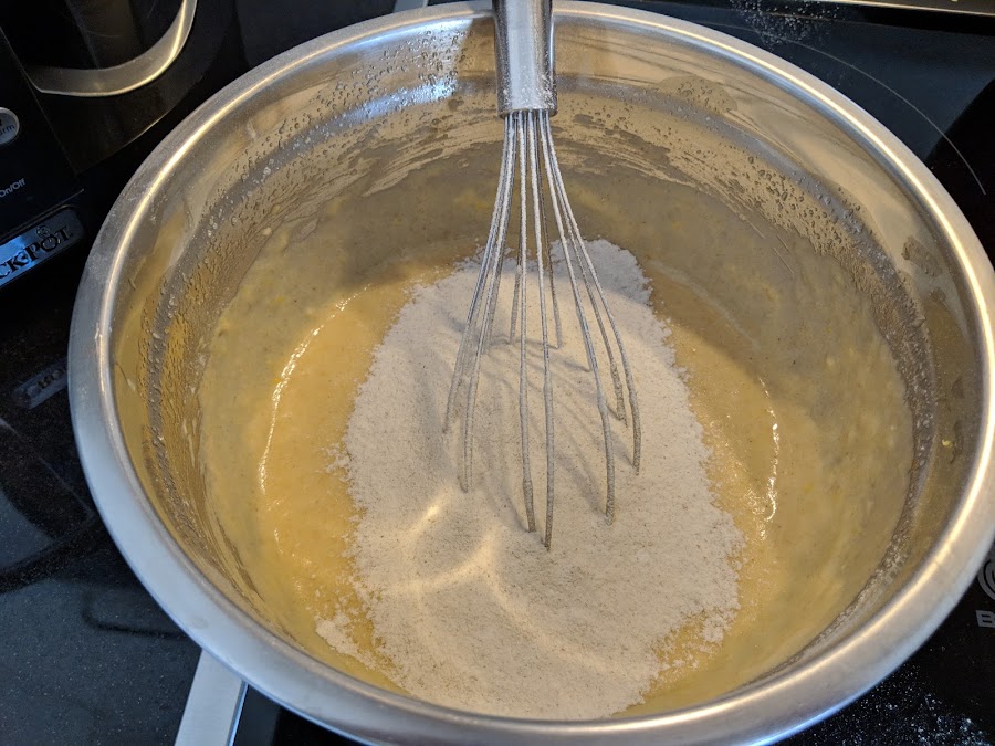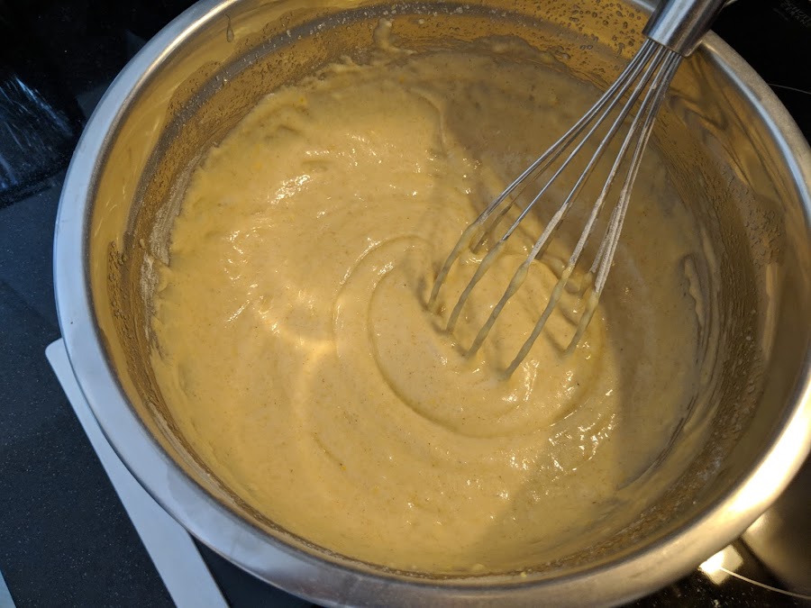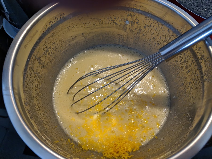 Incorporamos el zumo y la ralladura. Seguimos batiendo. Por último tamizamos la harina mezclada con la levadura, en 3 veces: así aireamos bien la harina y evitamos los grumos