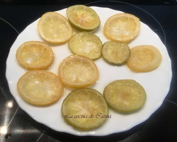 Colocamos las rodajas de limón y lima con el almíbar de azúcar en un cazo y lo dejamos cocer todo a fuego lento durante 10 minutos aproximadamente. Escurrimos las rodajas y las dejamos enfriar.