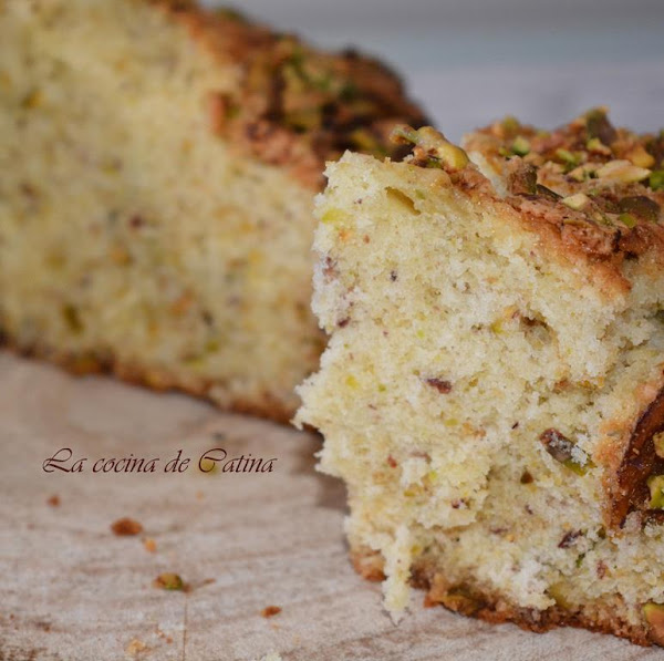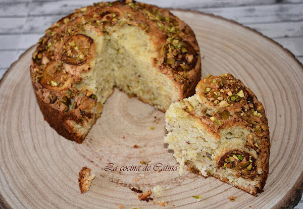 Vertemos la mezcla en el molde, colocamos las rodajas de lima y limón sobre la masa y esparcimos el resto de los pistachos por encima.