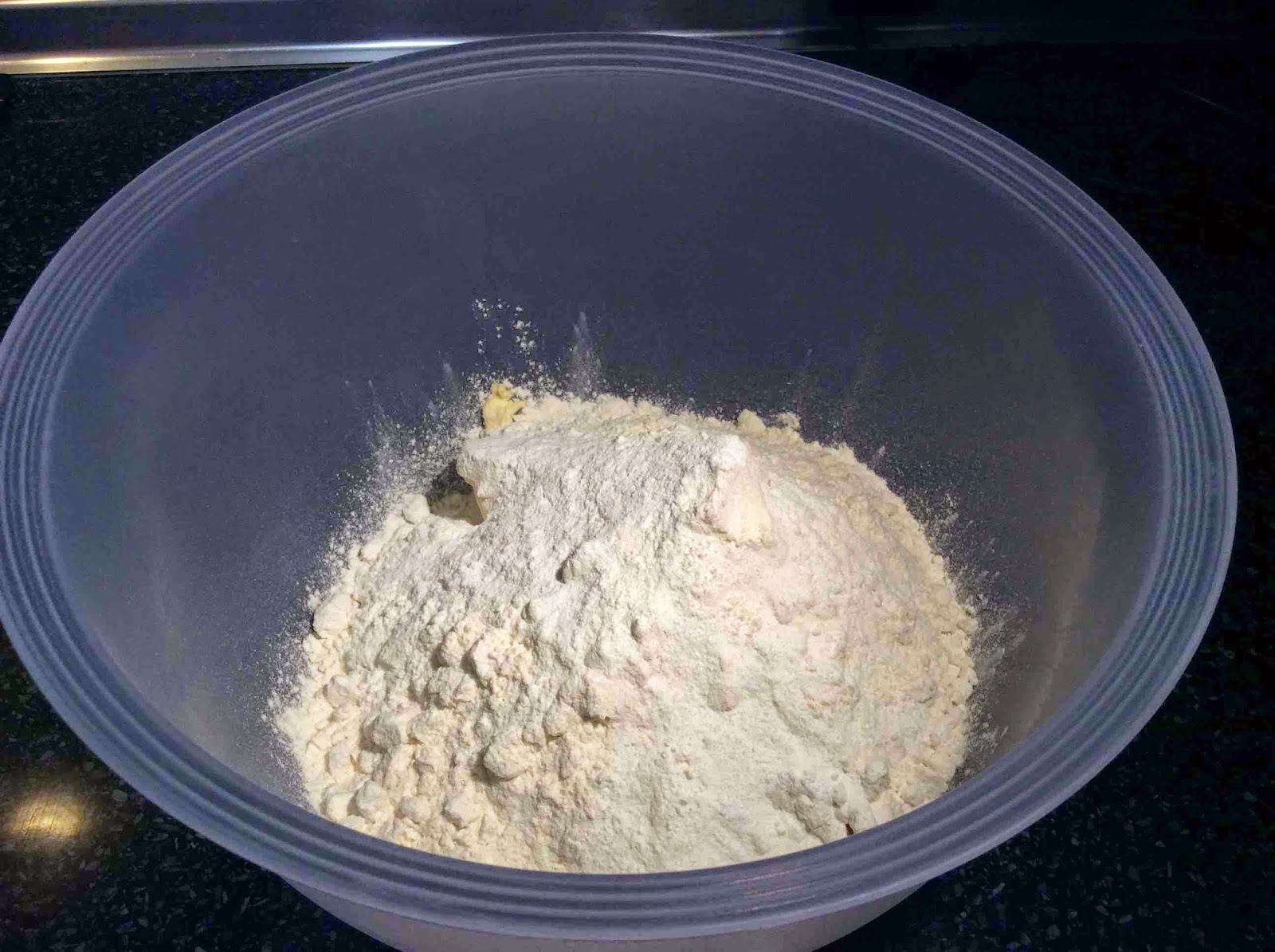 3: En otro bol mezclamos la margarina a temperatura ambiente con el azúcar, la harina y la levadura.