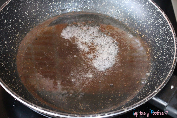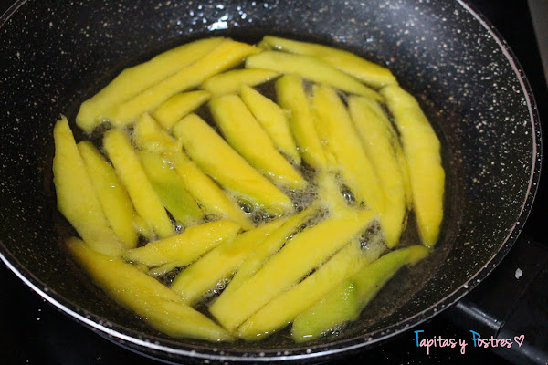 Cuando el azúcar se haya dorado añadimos cuatro cucharadas de agua. Cortamos el medio mango en rodajas o trozos y lo ponemos encima del caramelo que estábamos haciendo. Cocinamos a fuego lento hasta que quede poco almíbar. yo creo que ese fue mi error, dejé que se evaporara por completo el líquido. Así que os recomiendo que dejéis un poco de almíbar en el fondo de la sartén.