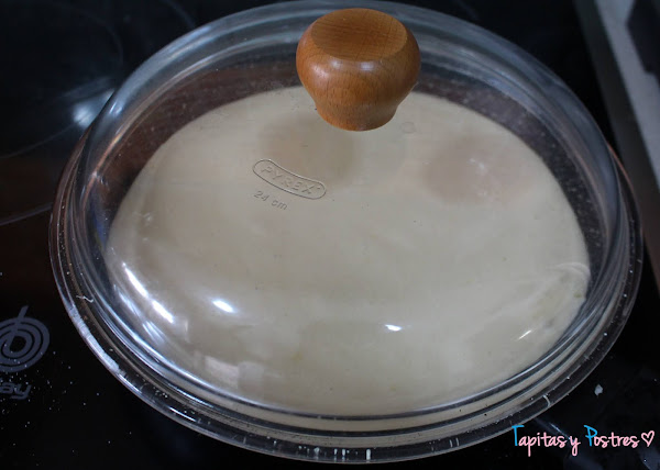 Tapamos la mezcla y cocinamos a fuego muy bajo. Mi vitro tiene nueve niveles, y yo cociné el bizcocho en el nivel 35. Vamos a dejarlo tapado 30 minutos. Al pasar este tiempo, veremos que la parte superior está cocida pero no del todo. Si la notáis líquida aún, dejamos diez minutos más. Cuando esté cocida, le vamos a dar la vuelta como si fuera una tortilla. Yo usé una tapadera distinta, de las planas que engrasé con aceite para que no se pegara. una vez que le damos la vuelta, cocinamos quince minutos más.