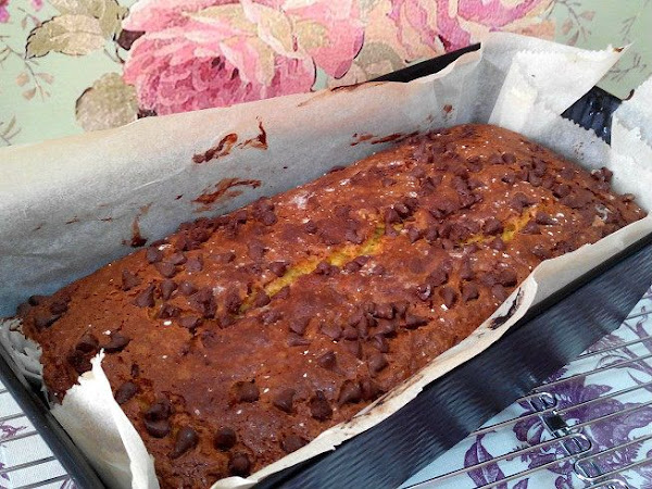 Echamos la masa en un molde grande de plum cake forrado con papel de horno, ponemos los chips de chocolate que teníamos reservados por encima e introducimos en el horno, cocemos unos 50-60 minutos aproximadamente; ya sabéis, el tiempo puede variar dependiendo de cada horno. Pasado el tiempo de horneado, comprobamos que está bien hecho pinchándolo con un brocheta, si sale limpia, lo sacamos. En caso de que salga con algo de masa, lo dejaremos unos minutos mas.