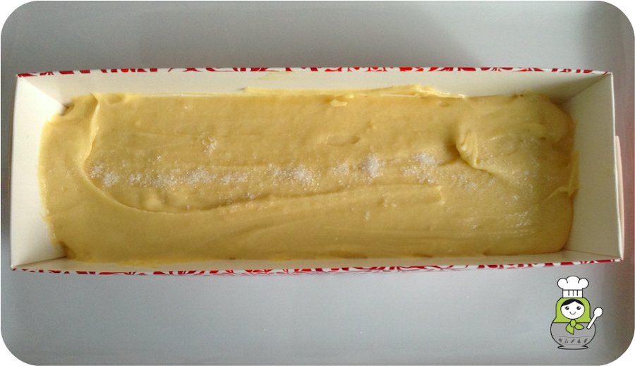 Engrasamos un molde con un poco de mantequilla o de aceite de oliva suave y vertemos la masa dentro. Si queréis podéis espolvorear un poco de azúcar sobre la masa, como se hace con las magdalenas.