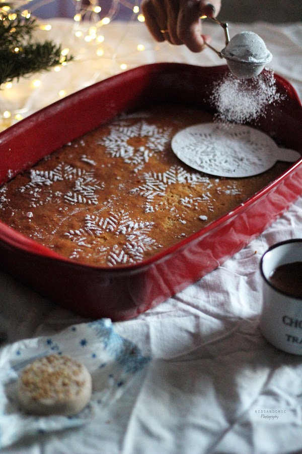 Deja enfriar antes de decorar con azúcar glas. Yo usé unas plantillas con forma de copos de nieve , pero si no tienes, usa una blonda de papel, un pañito limpio para dar un poquito de arte al glaseado .