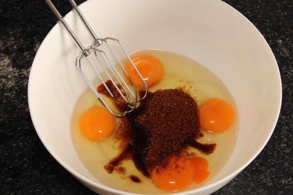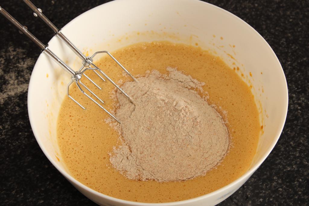 En otro bol amplio batimos con varillas eléctricas los huevos y el azúcar hasta que espumen y aumenten de volumen. Incorporamos las harinas, la levadura y el aceite de oliva, seguimos batiendo.