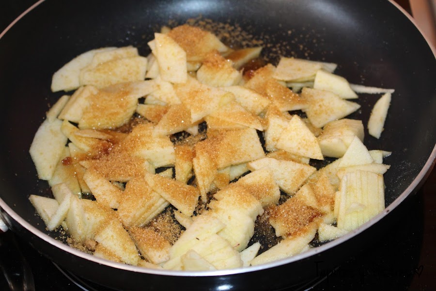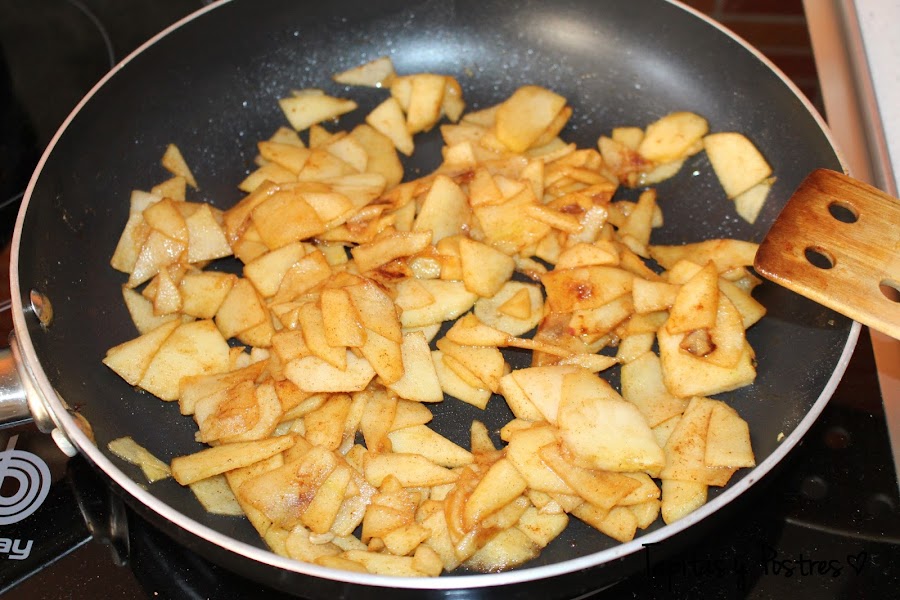 Ponemos la mantequilla a fundir en una sartén y cuando se derrita añadimos las laminas de manzana junto el azúcar y la canela. Damos unas vueltas hasta que las manzanas estén blanditas. Reservamos.