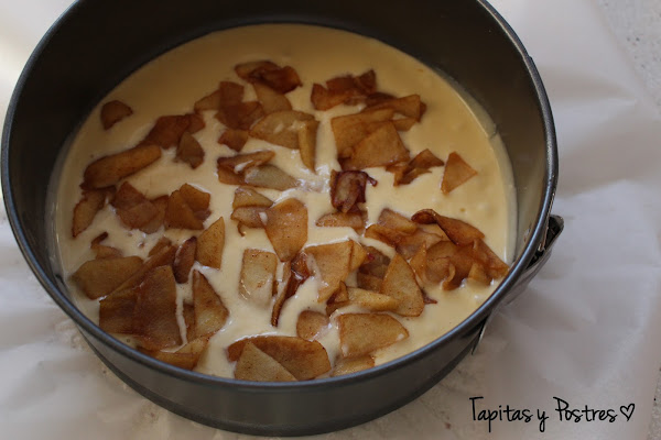 Echamos el resto de la masa y acabamos con una capa de manzanas. Al horno.