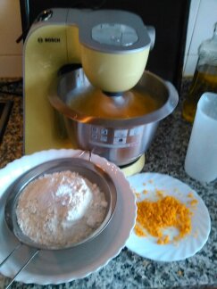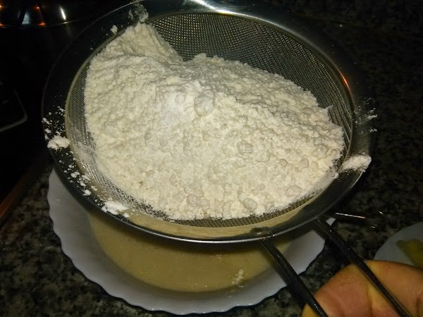 pondremos la harina que previamente habremos tamizado junto a la levadura y el papelillo de gaseosa , que como ya sabéis se deben utilizar los dos colores que van juntos, mezclamos bien paramos la batidora y ponemos las tres manzanas que teníamos laminadas lo mezclamos todo con espátula o cuchara de madera pero sin batir.