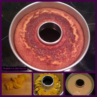 Cortaremos el resto de melocotones en rodajas y las colocaremos en el molde, sobre el caramelo( yo he untado el molde con mantequilla antes de poner el caramelo, para poder desmoldarlo mejor). Verteremos la mezcla encima y al hono a 180ºC. Yo lo he tenido casi una hora pero, dependerá de cada horno..Ya sabéis, haced la prueba pinchando con un cuchillo o una brocheta y si sale limpio.....ya está!