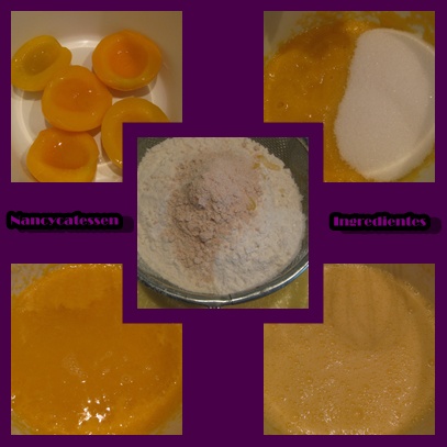 Mientras se hace el caramelo, podemos ir haciendo la mezcla del bizcocho. Empezaremos triturando 5 mitades de melocotón y añadiendo el azúcar. Batimos bien y lo siguiente será echar un vaso del jugo del melocotón y mezclar, para seguir con los huevos. Tamizaremos la harina, la levadura y el flan y batiremos bien hasta obtener una mezcla esponjosa.