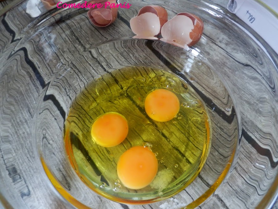 En un bol, batir los huevos junto con la sal el azúcar y el aceite, luego añadir el membrillo triturado.