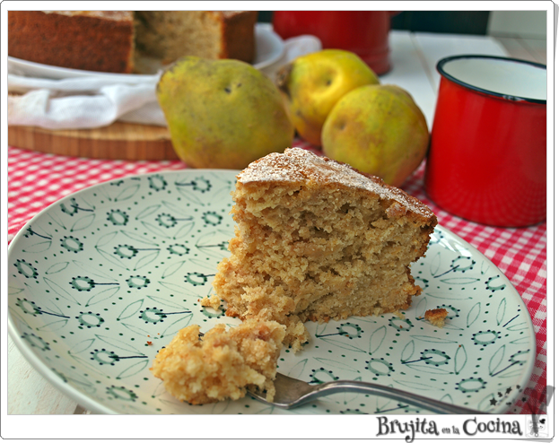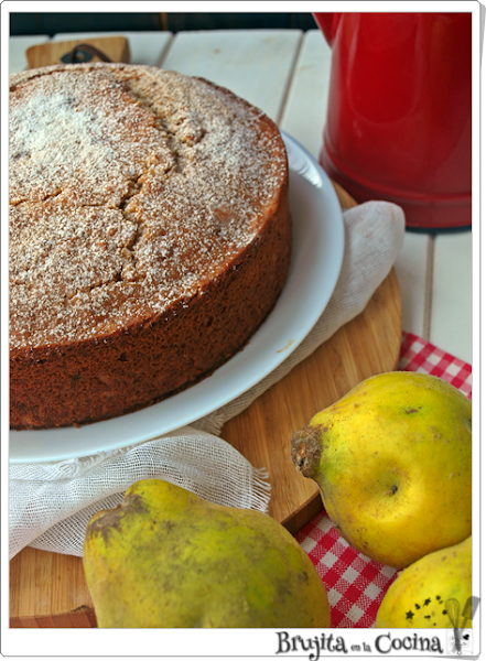 Bueno pues a lo que iba, yo creo que no había visto un membrillo en fruta hasta que me dí cuenta que en la finca de mis suegros tenían un par de árboles. Así que el otro día me dio por traerme unos para probar y hacer un bizcocho, porque es una fruta poco conocida tiene muchas cualidades como que aporta energía, baja la hipertensión, ayuda a cicatrizar heridas, protege de los resfriados (cosas que esta época viene bien), tiene fibra y Vitaminas A, C, B, protege la piel, ayuda a las funciones cerebrales y reduce el colesterol... vamos una joya bastante desconocida.