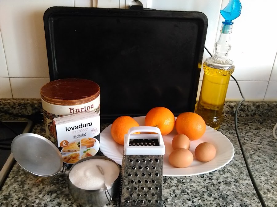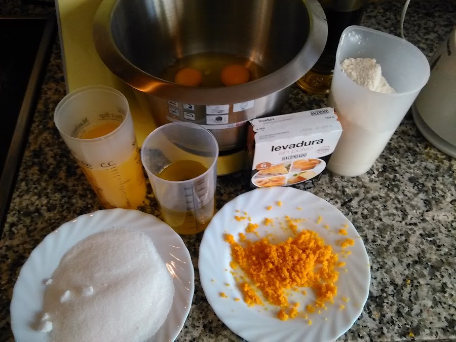 Siempre empezaremos preparando los ingredientes para que las mezclas no tengan que andar esperando ,con lo cual empezaremos rayando las naranjas que habremos lavado cuidadosamente ,reservamos la rayadura,estas mismas naranjas las exprimiremos ,se necesitarian 300 ml si no uviese suficiente exprimiremos las que sean cesáreas,pondremos la levadura con la harina ya que mas tarde las tamizaremos juntas, pesamos el azúcar