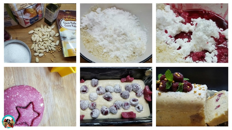 1.- Preparamos el mazapán: en un bol ponemos las almendras molidas y las mezclamos con el azúcar y el juego de algunas frambuesas. Lo mezclamos todo bien hasta conseguir una pasta. Con un corta pasta en forma de estrellas formamos unas estrellas.