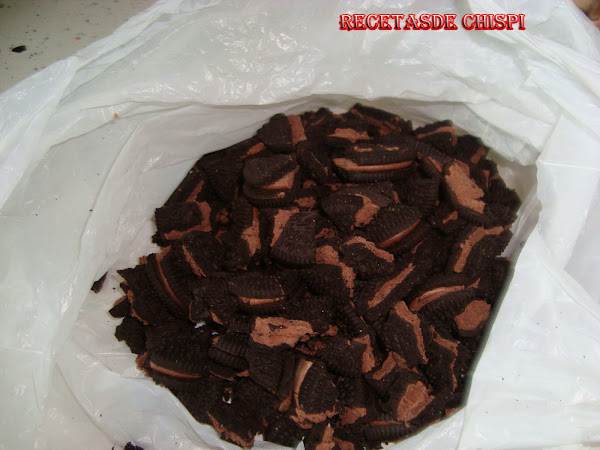 Meter las galletas troceadas en una bolsa de plástico y pasarle el rodillo por encima hasta que esten trituradas( yo despues de la bolsa utilicé un molinillo de café).